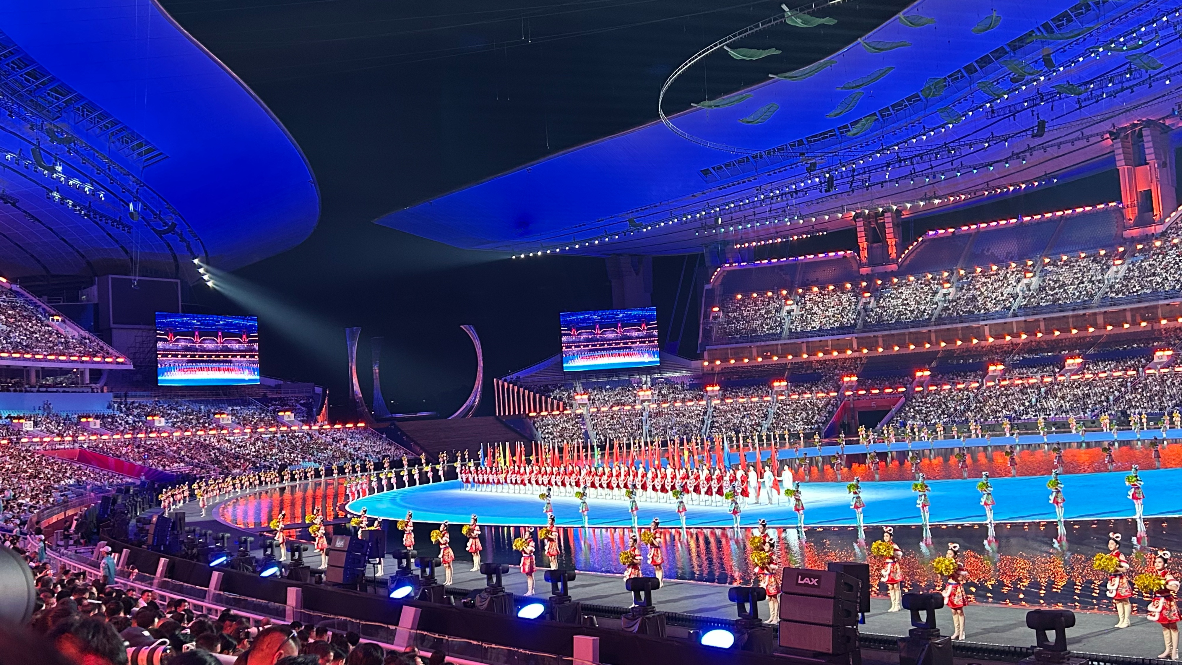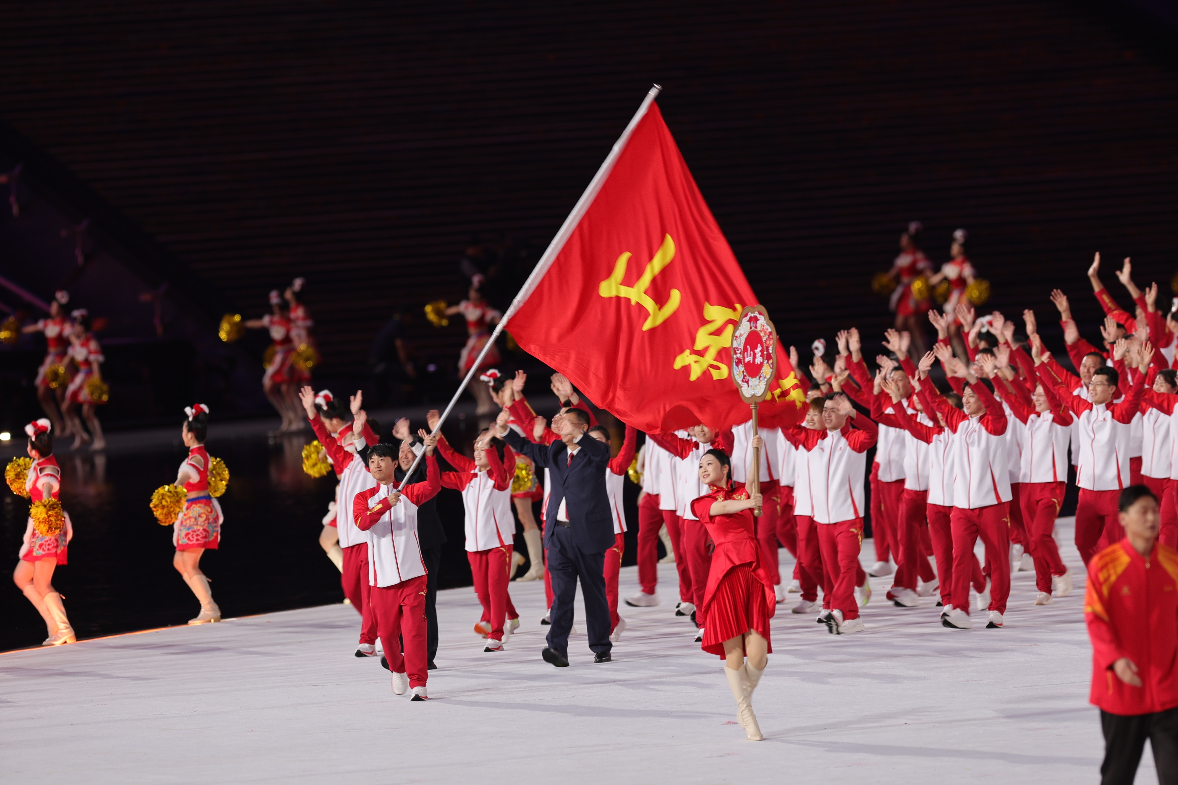 11月9日20时,中华人民共和国第十五届运动会开幕式在广东奥林匹克体育中心举行。各参赛代表团代表入场,山东省代表团亮相,获得掌声与欢呼。